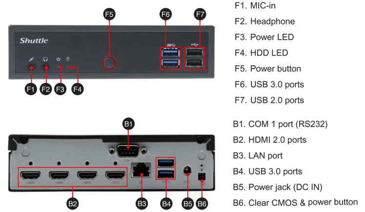| BACK PANEL | (1) RJ45 Gigabit LAN port (4) HDMI port (2) USB 3.0 ports (1) RS232* (1) External power on/Clear CMOS header (1) Kensington lock (2) Wireless Antenna fixture |